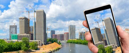 Hand holds smartphone taking photo of construction site with tall buildings under construction. Urban cityscape with cranes and scaffolding in bright daylight.