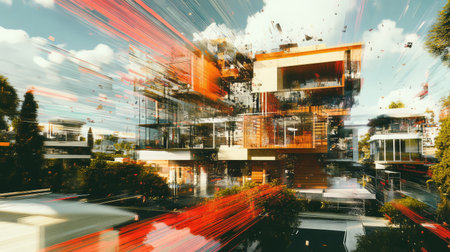 Glitch architecture features distorted buildings in urban setting with digital errors