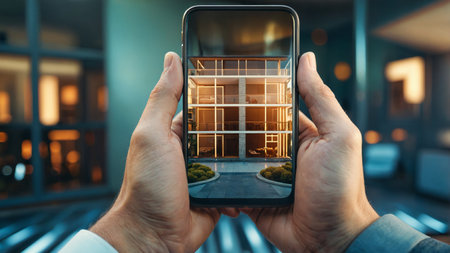 An AI generated illustration of a man using a smartphone to view a 3D visualization of a building