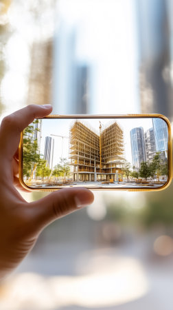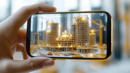 Hand holding smartphone to capture digital rendering of construction site with tall buildings and cranes in busy urban environment. Concept of architecture, construction technology, urban development.