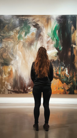 A woman stands in front of a large abstract painting in a modern art gallery. She appears focused and contemplative, exploring the colors and forms of the artwork.