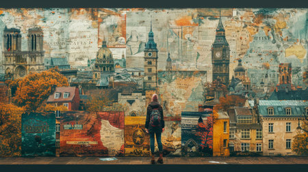 Hipster girl on the background of the wall with the image of famous places in Europe