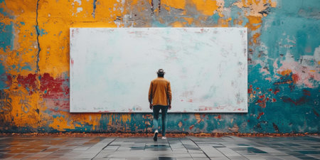 Back view of a person in a brown jacket standing in front of a large blank canvas set against a colorful graffiti wall on a city street.