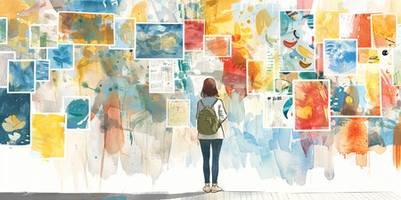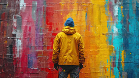 A person stands with their back to the viewer, gazing at a vivid watercolor backdrop filled with bold hues of orange, yellow, and blue. The setting radiates artistry and inspiration.