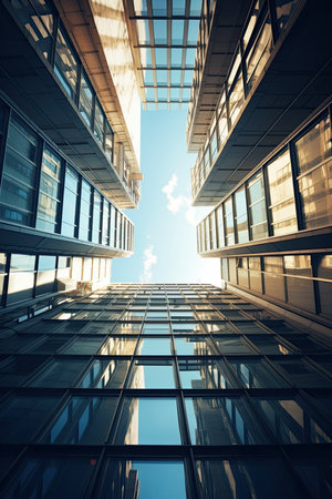 underside panoramic and perspective view to steel blue glass high rise building skyscrapers, business concept of successful industrial architecture