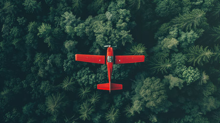 Red plane flying over lush green forest - ai