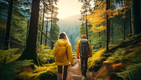 Back view of two women walking in autumn forest. Travel and active lifestyle concept
