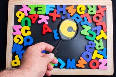 Scattered colorful alphabet with a magnifying glasses. Learning and education concept. Finding keywords. Language learning.