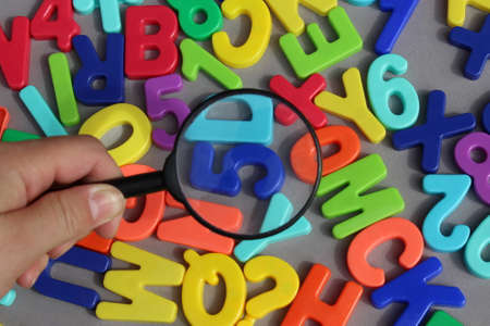 Female hand holding a magnifying glass over numbers and letters