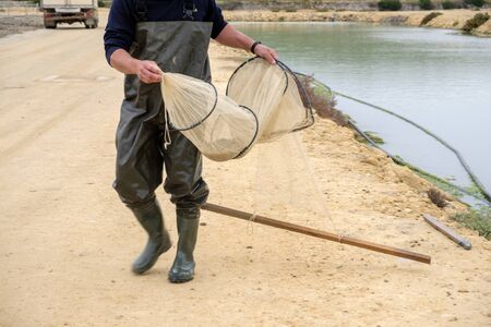 Fisherman holding fishing net with catch at riverside, closeup