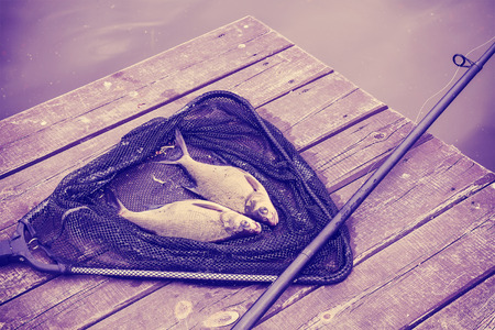 Vintage toned common breams (Abramis brama) on a fishing net, fishing background.