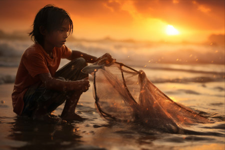 The hand of the fisherman holding fishing net at sunset.