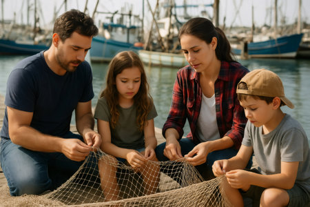 Fisherman repairs fishnets fishing lines