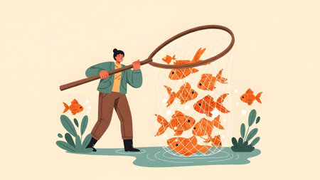 Hobby showing person catching many goldfish in a net in shallow water