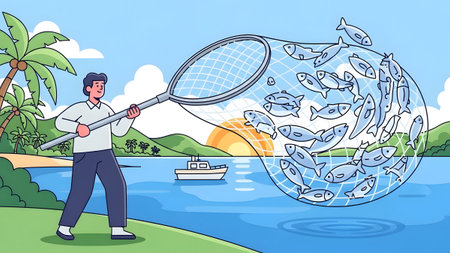 A man holds a fishing net full of fish near a tropical island. Clear details and vibrant colors e...