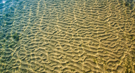 Textured sand ripples are visible beneath clear, shallow water, illuminated by sunlight casting golden and yellow tones with hints of submerged...
