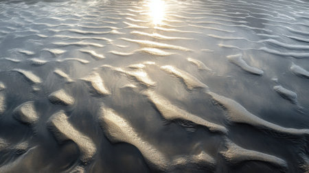 This close-up image captures the captivating patterns and textures of wet sand illuminated by golden sunlight during low tide at the beach.