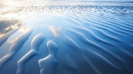 Captivating beach landscape features gentle ripples and glistening sunlight reflecting off damp sand, creating a serene and tranquil atmosphere.