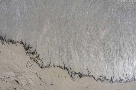 Close up of some wet mud and sand of beach with some water lines