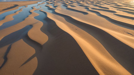 Delicate patterns of ripples and waves left in the sand after the tide recedes, capturing the beauty of nature.