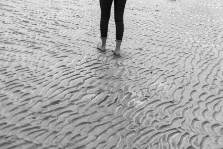 Walking free on the wet sand smoothed by the waves of the sea