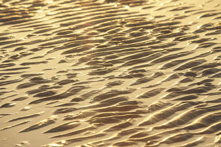 Sand waves texture with water on the sea beach. Yellow sand texture for background.