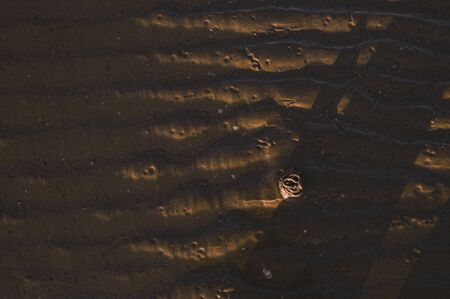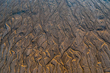 Wavelets formed on the sand and silty-clay shore. Pattern. Brown and gold colors. Sand patterns on the beach at low tide.