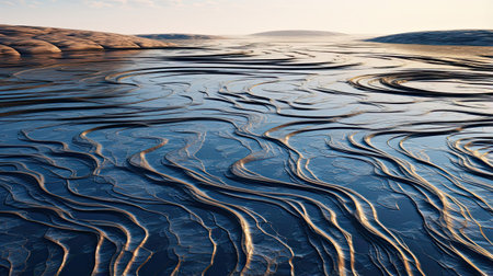 a national geographic photo captures the beauty of a dune shoreline with flowing water, showcasing intricately detailed patterns and organic formations. the british topographical scene is depicted with tangled forms, while a touch of dry wit humor adds a unique element. the matte finish of the photo enhances its artistic appeal. ai generated