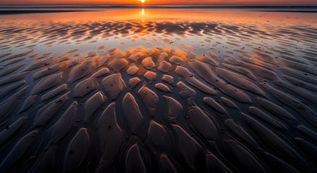 A beautiful sunset over a beach at low tide creates intricate patterns in the wet sand. The setting sun casts a warm, golden glow that reflects on the water in the sand ripples, creating a serene and textured landscape.