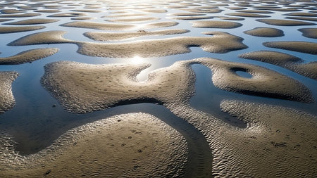Tidal showing tidal pools and sand ripples reflecting the bright sun on a sandy beach during low tide creating abstract patterns of light and shadow on the wet...