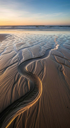 Close-up view of rippled sand patterns and shallow water reflecting the warm glow of sunset on a tranquil coastline