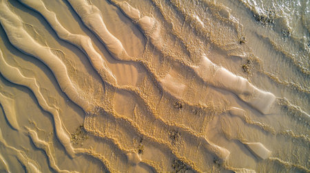 Aerial top view of clear water and patterned sand as the tide comes in at the beach.