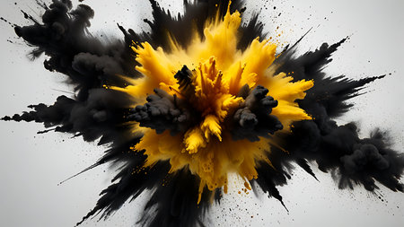 High-speed capture of yellow and black powder mix explosion suspended in air against a bright white background in dramatic form