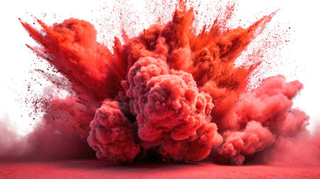 A vibrant cloud of red powder bursts outwards, creating a dynamic visual effect. The image showcases a high-speed capture with contrasting textures, the fluffy powder contrasted with the sharp edges of the background. Suitable for artistic concepts and commercial applications, the image is devoid of specific settings.