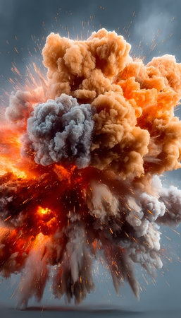 A large explosion bursts forth, showcasing vibrant flames and thick smoke, with debris flying through the air, creating an intense and chaotic atmosphere