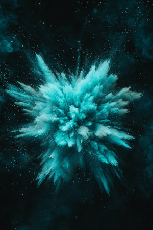 Witness the dazzling eruption of turquoise particles exploding with glowing dust, dynamically spreading outward in a mesmerizing cosmic display against a dark backdrop.