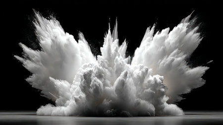 An image showcases a dynamic explosion of white powder against a dark background. The composition emphasizes the voluminous, cloud-like texture of the powder. The visual style is dramatic, with a focus on form and movement, appropriate for various design projects or commercial applications.