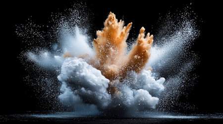 A white powder erupts forcefully, forming a large cloud in a dark environment, capturing the intensity of the moment.