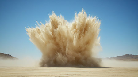 A dynamic dust explosion freezes mid-motion, highlighting the fine texture of particles in the air.