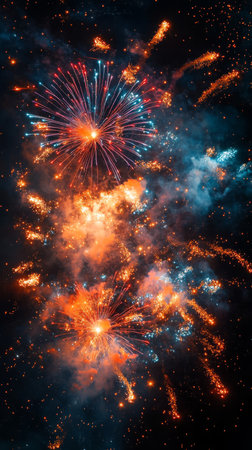 A breathtaking burst of colorful fireworks starts lighting up the dark night sky, creating a truly stunning visual spectacle filled with vibrant hues and dynamic patterns that captivate the audience