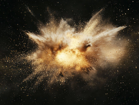 intense explosion of gold particles erupts outward, leaving glowing trails that radiate heat and energy in a striking cosmic display against a black background.