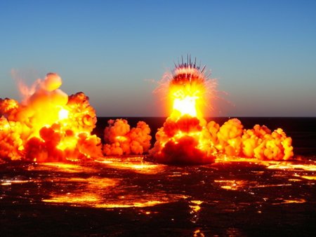 Nuclear explosion is process of releasing large amounts of thermal and radiant energy as result of uncontrolled chain nuclear fission reaction in a very short time. AI generated. Thermonuclear fusion.