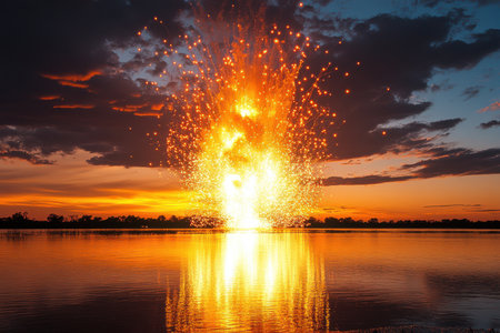 A breathtaking scene of a massive explosion at sunset, featuring vibrant flames and flying debris against a serene water backdrop, creating a striking contrast.