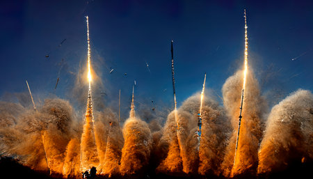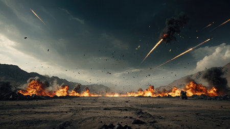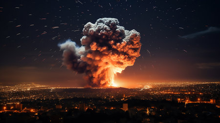 An AI generated illustration of an explosion erupting in the sky with debris emanating from the ground