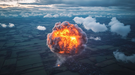 Captivating aerial perspective of a massive explosion revealing fiery colors and thick smoke rising among a vast landscape, capturing raw intensity.