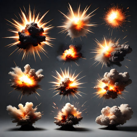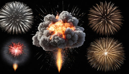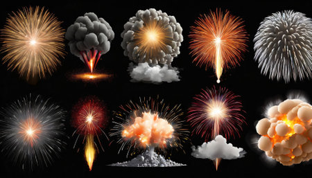 High-quality collection of explosive effects isolated on a transparent background, including fiery blasts, smoke plumes, and energy bursts. Ideal for creative projects in gaming, film, or