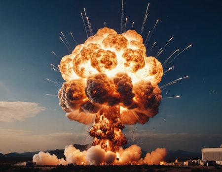 Nuclear explosion is process of releasing large amounts of thermal and radiant energy as result of uncontrolled chain nuclear fission reaction in a very short time. AI generated. Thermonuclear fusion.