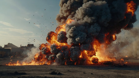 A large explosion bursts forth, showcasing vibrant flames and thick smoke, with debris flying through the air, creating an intense and chaotic atmosphere