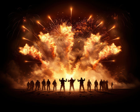 A dramatic explosion at night with intense fire, thick billowing smoke, and flying sparks, creating a chaotic and powerful visual impact.