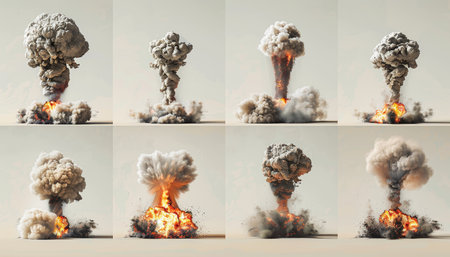 A detailed and dramatic set of nuclear explosions and mushroom clouds isolated on a transparent background. This striking visual collection highlights the iconic forms of atomic blasts for